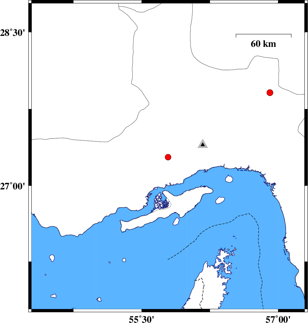 | 2013/08/06 | 00:08:20.0 | 04:38:20.0 | 27.28 | 55.79 | 18 | ML3 | Hormozgan Province, 50 km West of Bandar-e abbas |