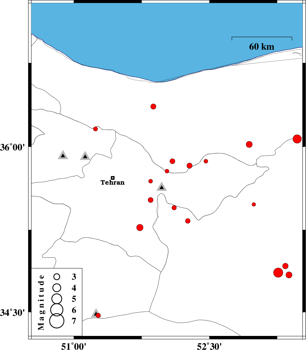 | 2013/07/30 | 10:19:38.2 | 14:49:38.2 | 35.69 | 51.85 | 18 | ML2 | Tehran Province, 20 km West of Damavand | ||