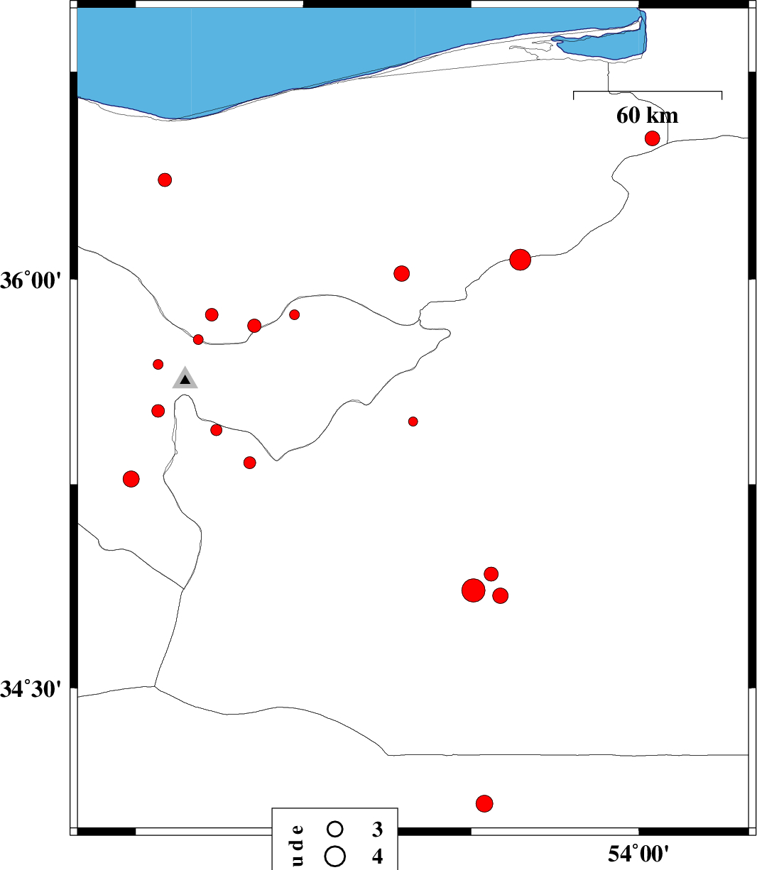 | 2013/08/03 | 15:25:07.3 | 19:55:07.3 | 34.86 | 53.26 | 15 | ML4.7 | Semnan Province, 80 km South-West of Semnan | ||