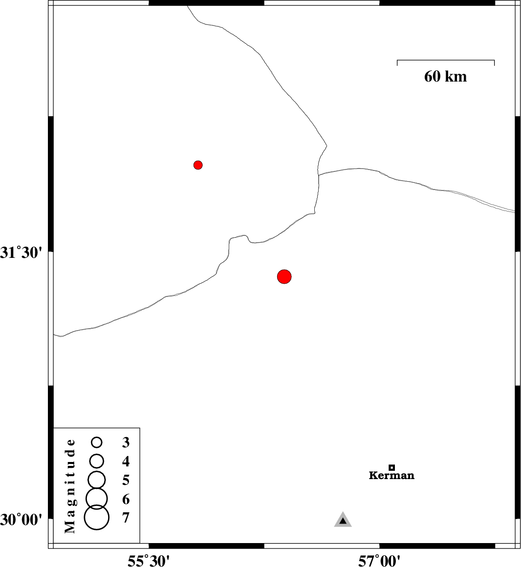 | 2013/08/14 | 16:36:30.6 | 21:06:30.6 | 31.36 | 56.38 | 14 | ML4.1 | Kerman Province, 42 km West of Ravar | ||