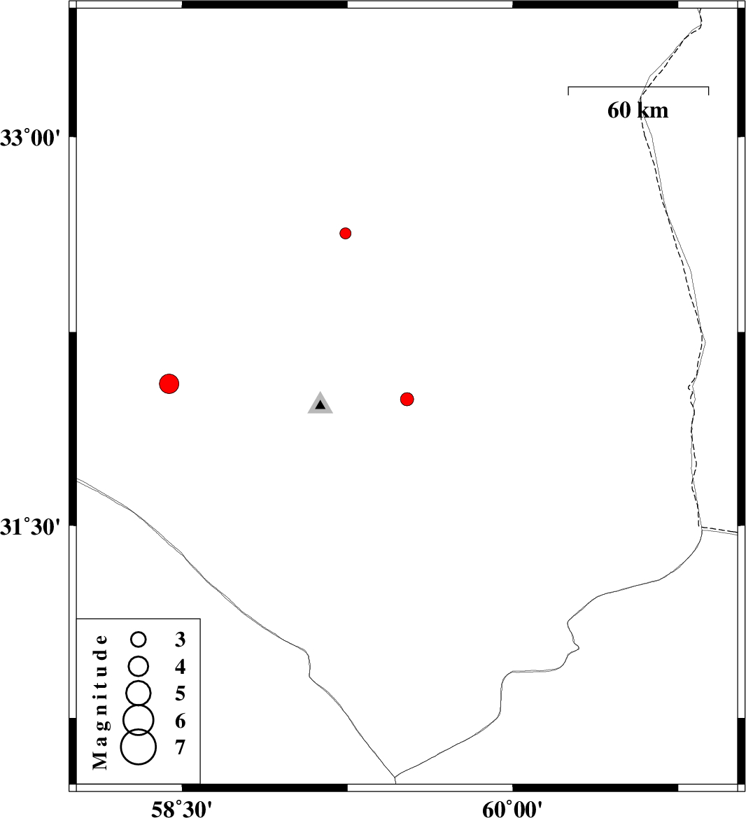 | 2013/07/26 | 12:00:47.4 | 16:30:47.4 | 32.63 | 59.24 | 34 | ML2.2 | Khorasan(south) Province, 30 km South of Birjand |