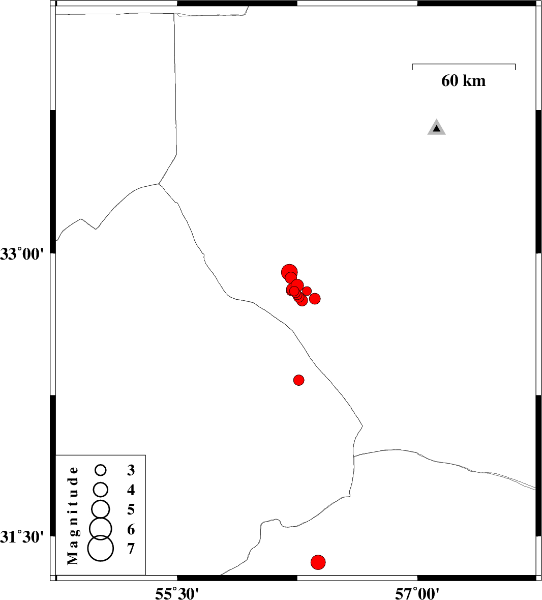 | 2013/08/15 | 20:08:41.7 | 00:38:41.7 | 32.9 | 56.2 | 14 | ML4.5 | Yazd Province, 103 km South-West of Tabas | ||