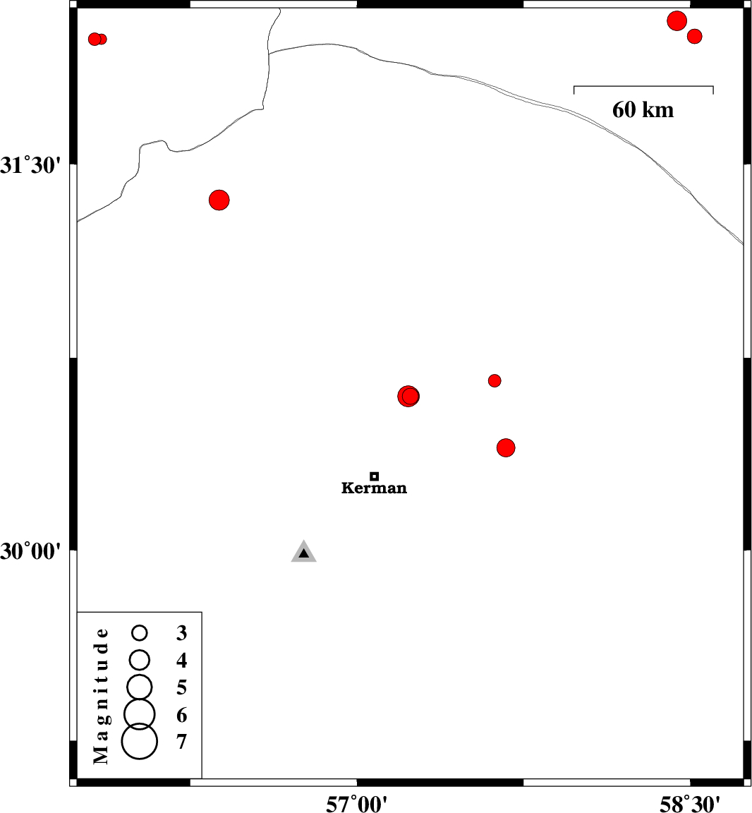 | 2013/08/25 | 12:55:36.1 | 17:25:36.1 | 30.6 | 57.24 | 14 | ML3.7 | Kerman Province, 38 km North-East of Kerman | ||
