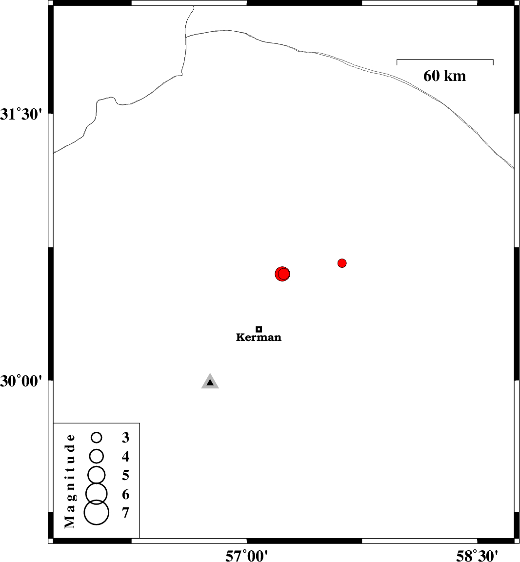 2013/08/21 01:26:40.3 05:56:40.3 30.6657.6214 ML2.5 Kerman Province, 66 km North-East of Kerman