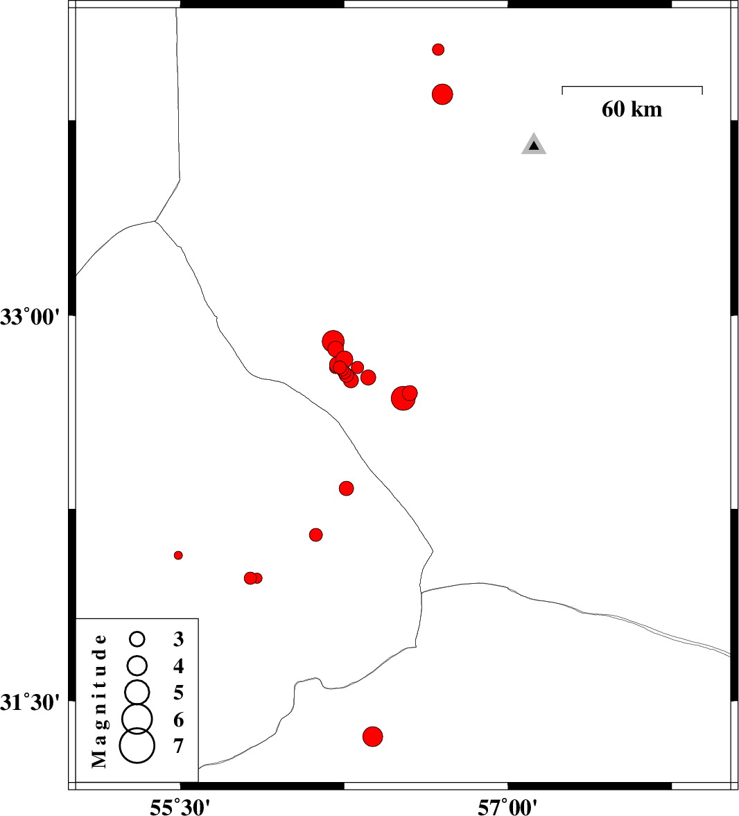 | 2013/08/17 | 01:33:44.1 | 06:03:44.1 | 32.8 | 56.21 | 6 | ML2.5 | Yazd Province, 111 km South-West of Tabas | ||