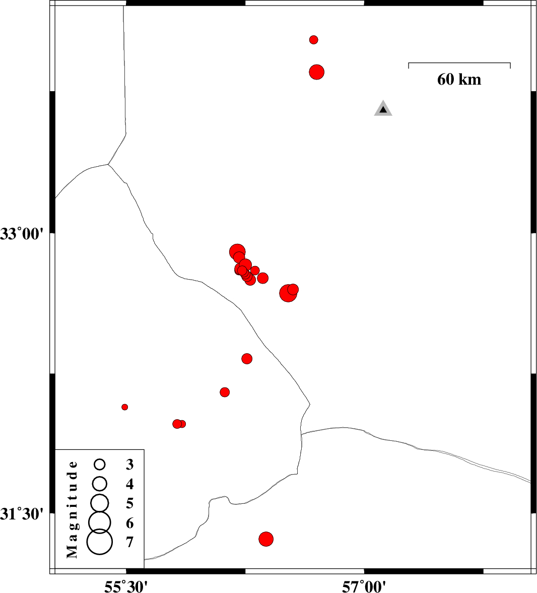 | 2013/08/17 | 01:33:44.1 | 06:03:44.1 | 32.8 | 56.21 | 6 | ML2.5 | Yazd Province, 111 km South-West of Tabas | ||