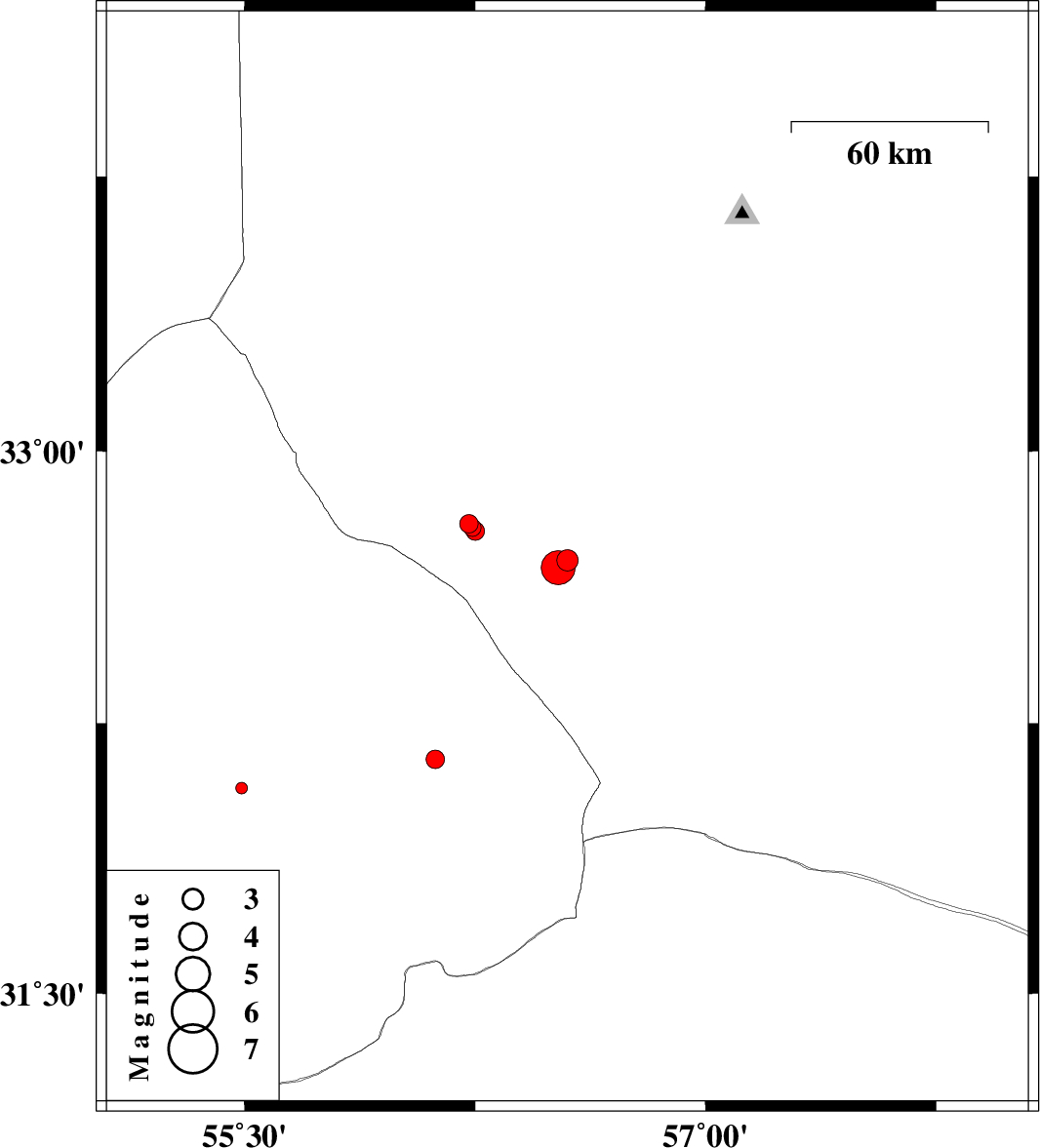 | 2013/08/20 | 12:04:45.2 | 16:34:45.2 | 32.78 | 56.25 | 14 | ML2.7 | Yazd Province, 111 km South-West of Tabas |