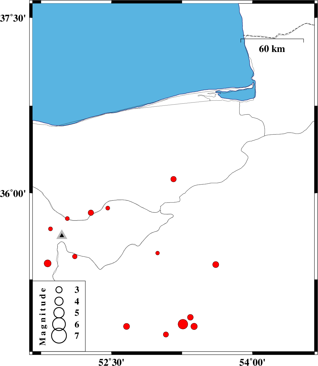 | 2013/08/03 | 15:25:07.3 | 19:55:07.3 | 34.86 | 53.26 | 15 | ML4.7 | Semnan Province, 80 km South-West of Semnan | ||