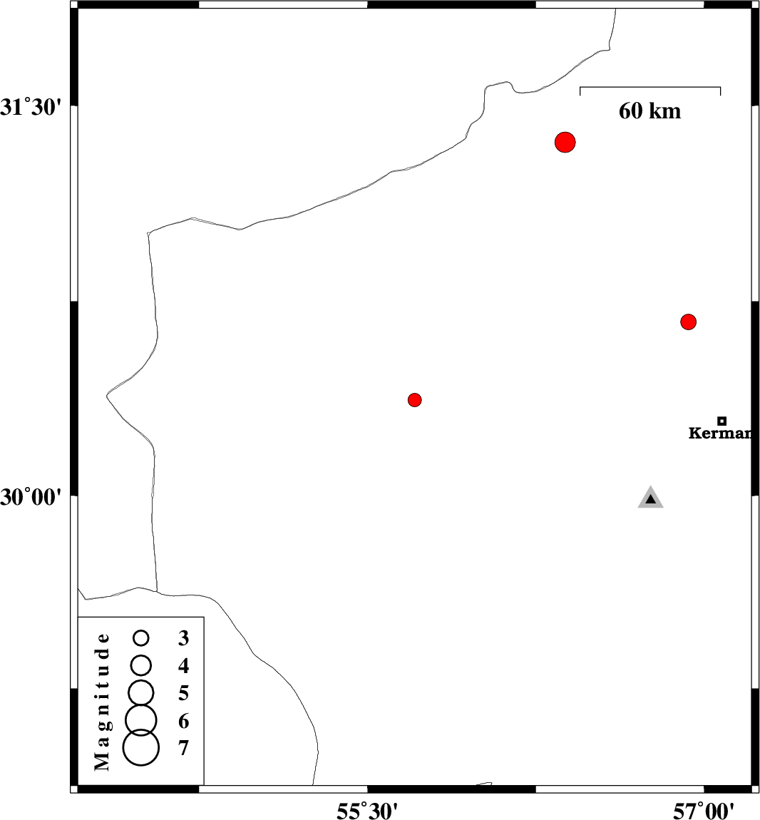 | 2013/08/27 | 00:54:56.3 | 05:24:56.3 | 30.67 | 56.93 | 15 | ML3.1 | Kerman Province, 38 km South-East of Zarand | ||