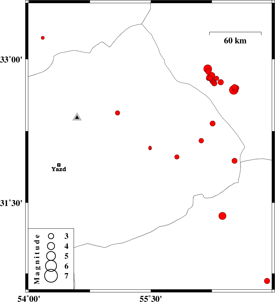 | 2013/08/15 | 20:08:41.7 | 00:38:41.7 | 32.9 | 56.2 | 14 | ML4.5 | Yazd Province, 103 km South-West of Tabas | ||