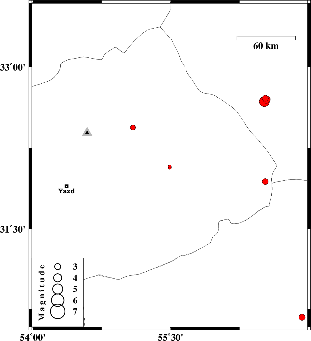 | 2013/08/28 | 02:03:44.1 | 06:33:44.1 | 32.69 | 56.54 | 15 | ML2.9 | Yazd Province, 108 km South-West of Tabas | ||