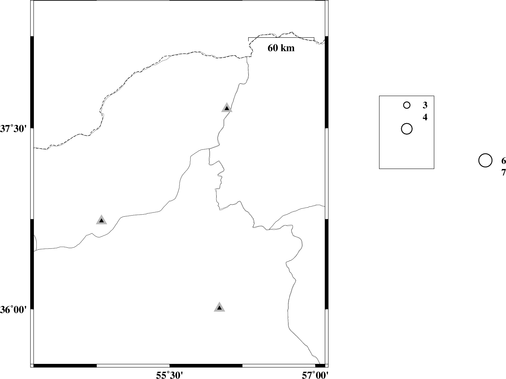 | 2013/08/09 | 11:43:36.4 | 16:13:36.4 | 38.54 | 55.77 | 11 | ML3.7 | Turkmenistan |