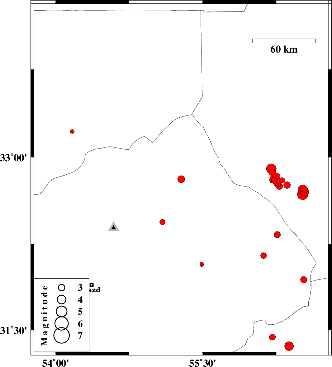 | 2013/08/15 | 20:08:41.7 | 00:38:41.7 | 32.9 | 56.2 | 14 | ML4.5 | Yazd Province, 103 km South-West of Tabas | ||
