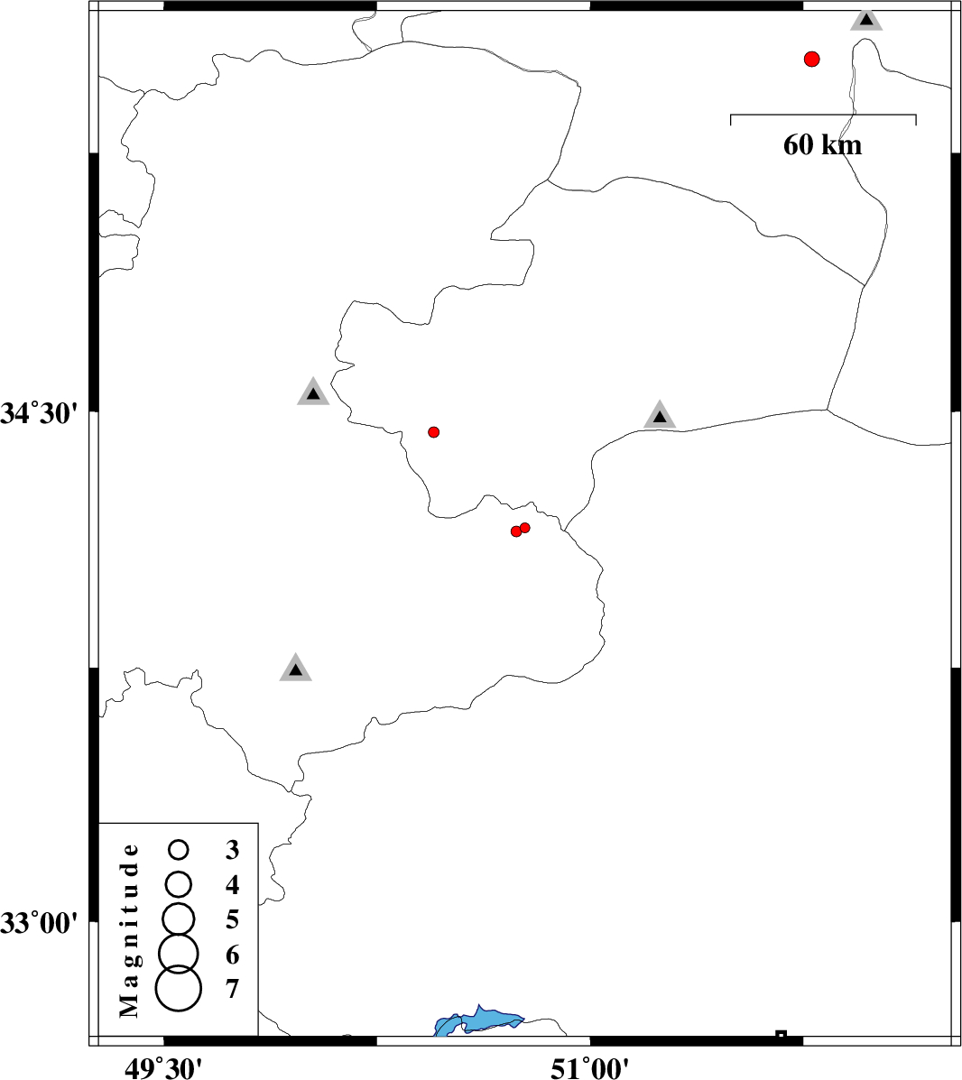 | 2013/09/04 | 09:34:19.1 | 14:04:19.1 | 34.44 | 50.45 | 38 | ML1.7 | Qom Province, 42 km East of Ashtiyan |