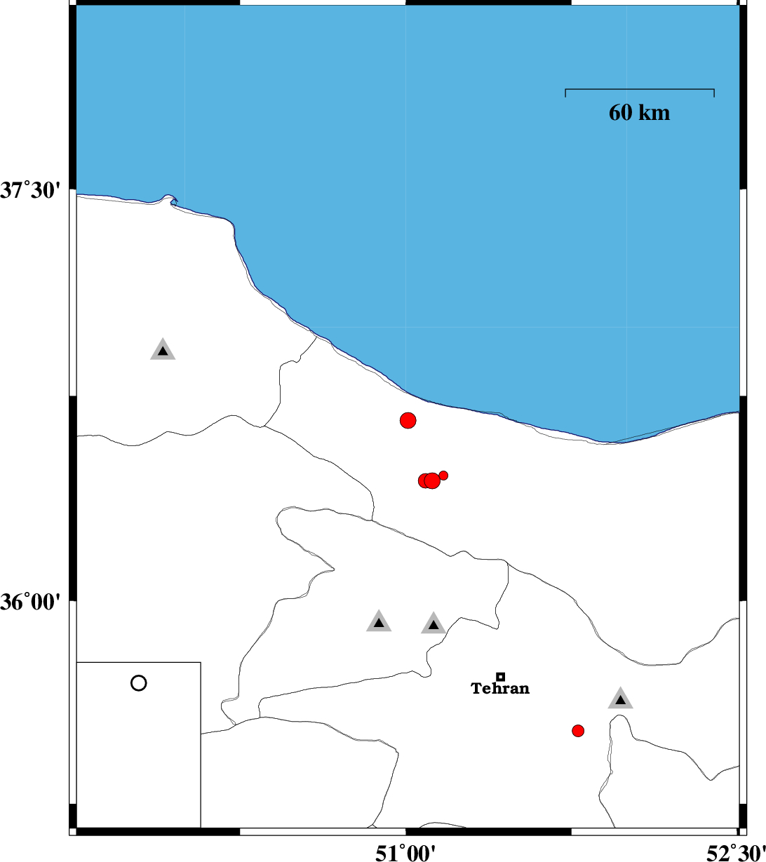 | 2013/09/12 | 02:32:32.4 | 07:02:32.4 | 36.66 | 51.01 | 14 | ML3.2 | Mazandaran Province, 20 km South-East of Tonekabon | ||