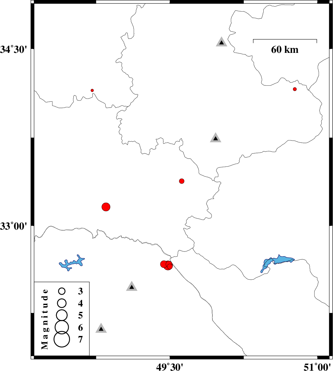 | 2013/09/13 | 00:25:49.9 | 04:55:49.9 | 33.16 | 48.85 | 14 | ML3.8 | Lorestan Province, 41 km South-West of Dorud | ||
