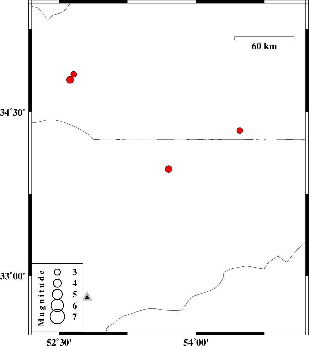 | 2013/08/25 | 23:58:31.5 | 04:28:31.5 | 34.84 | 52.66 | 26 | ML3 | Semnan Province, 51 km South-East of Garmsar |