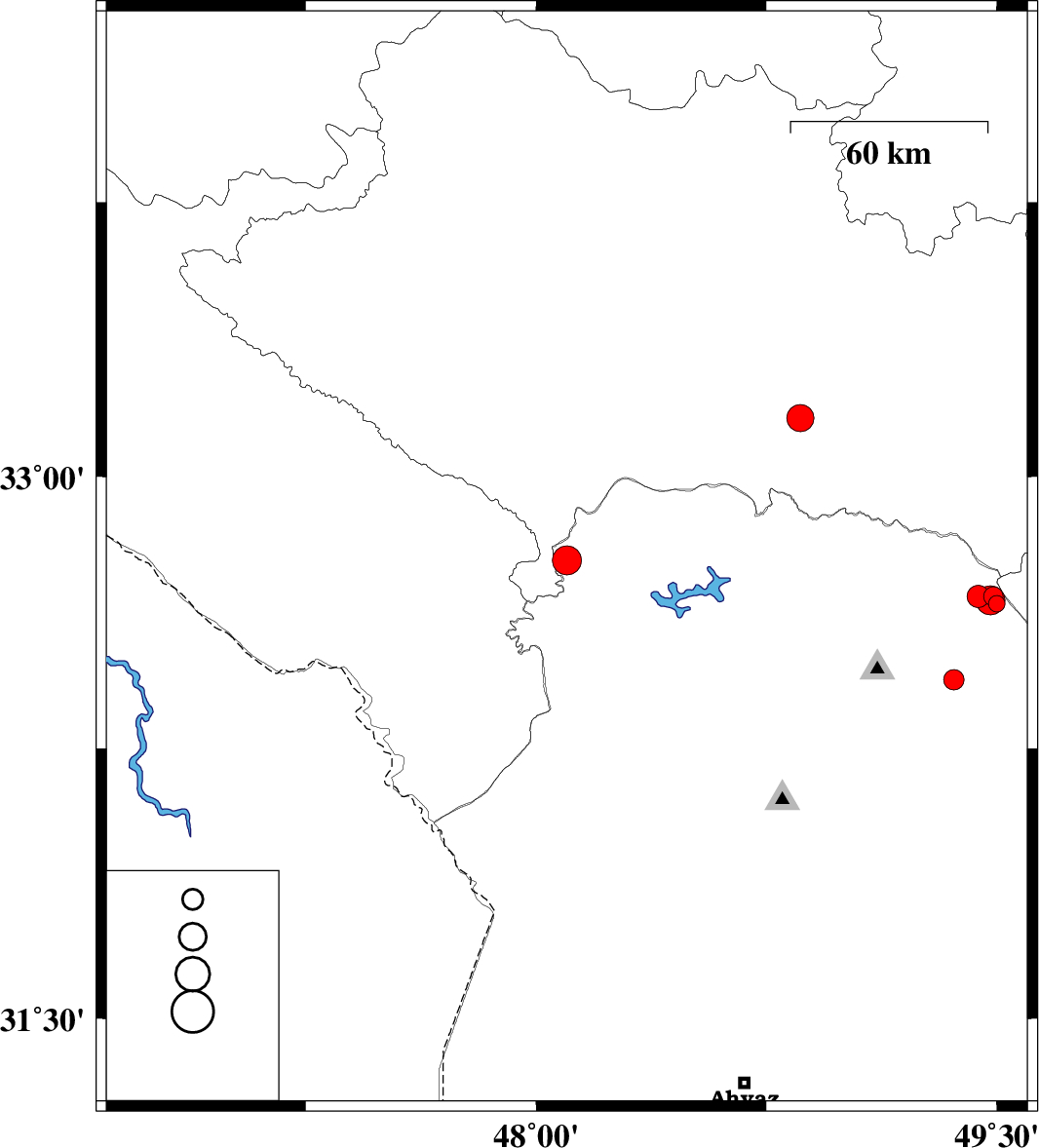 | 2013/09/20 | 05:11:59.5 | 09:41:59.5 | 32.44 | 49.36 | 14 | ML2.9 | Khoozestan Province, 24 km East of Lali | ||