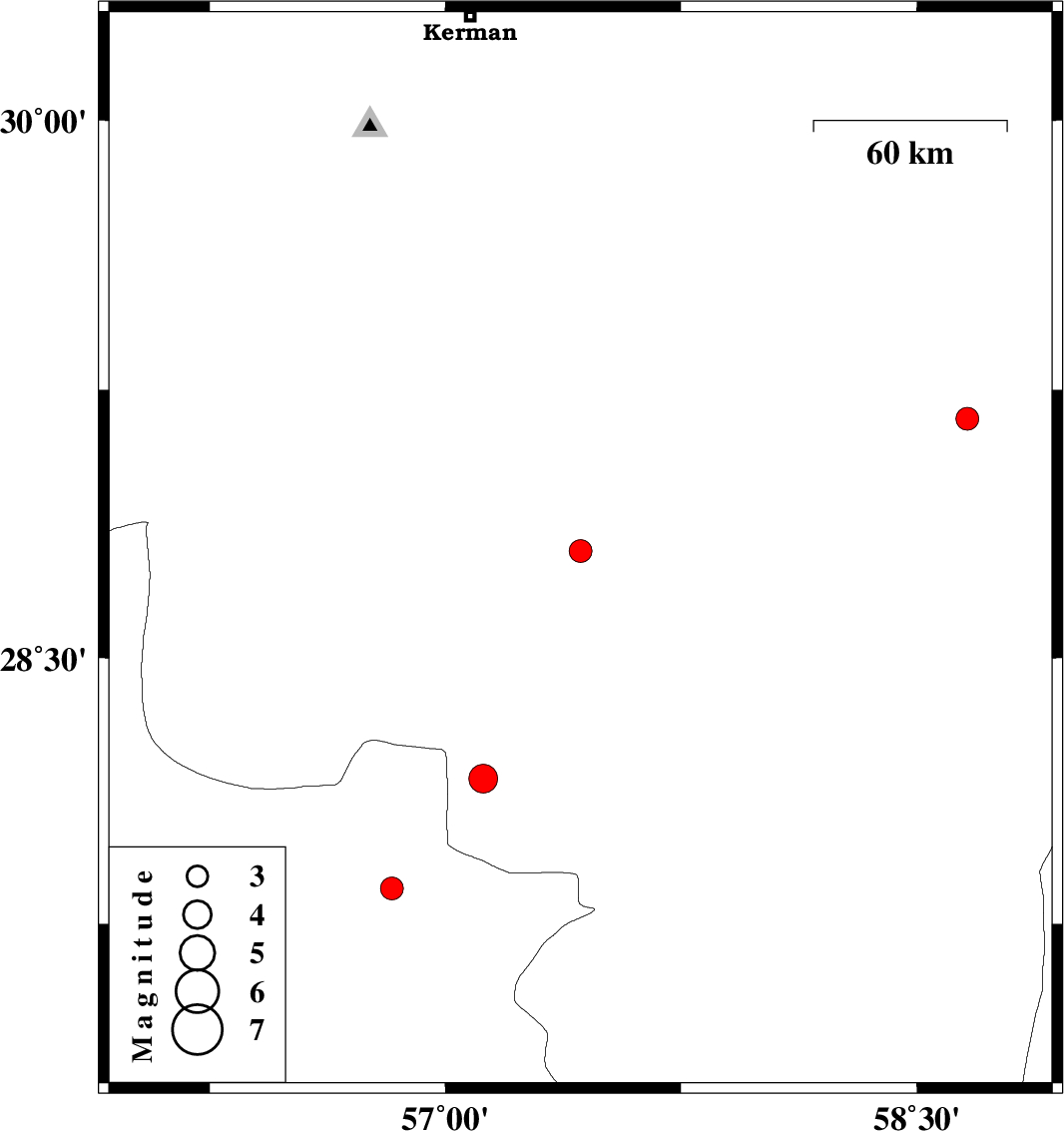 | 2013/09/02 | 00:36:10.3 | 05:06:10.3 | 29.17 | 58.66 | 14 | ML3.2 | Kerman Province, 31 km East of Bam |