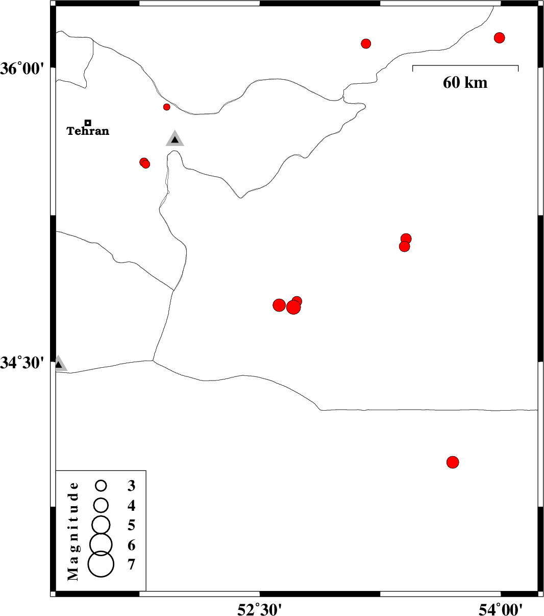 | 2013/09/27 | 03:57:36.7 | 07:27:36.7 | 34.81 | 52.73 | 14 | ML2.8 | Semnan Province, 57 km South-East of Garmsar | ||