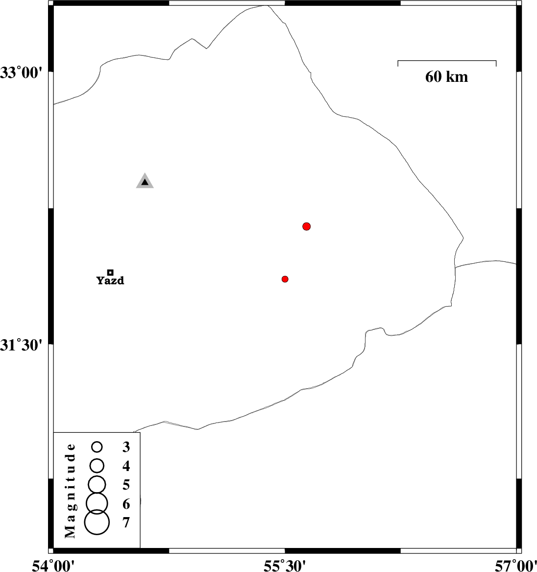 | 2013/10/03 | 10:19:38.6 | 13:49:38.6 | 31.86 | 55.5 | 14 | ML1.9 | Yazd Province, 30 km North-East of Bafq | ||