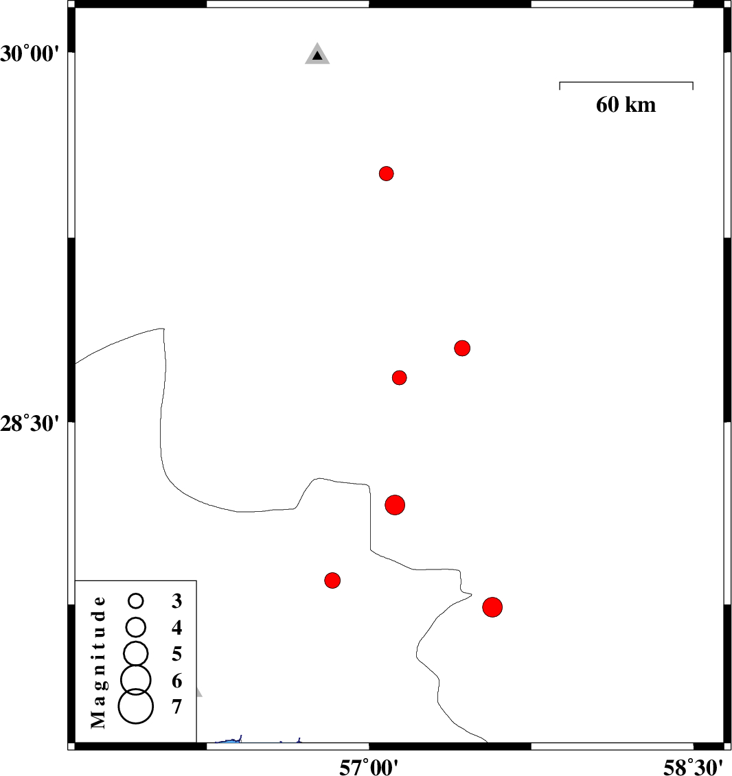 | 2013/09/24 | 04:43:26.9 | 08:13:26.9 | 28.8 | 57.43 | 15 | ML3.2 | Kerman Province, 34 km North-West of Jiroft | ||