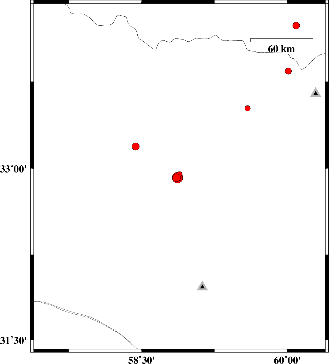 | 2013/10/04 | 18:44:37.3 | 22:14:37.3 | 32.95 | 58.89 | 15 | ML2.5 | Khorasan(south) Province, 33 km West of Birjand | ||