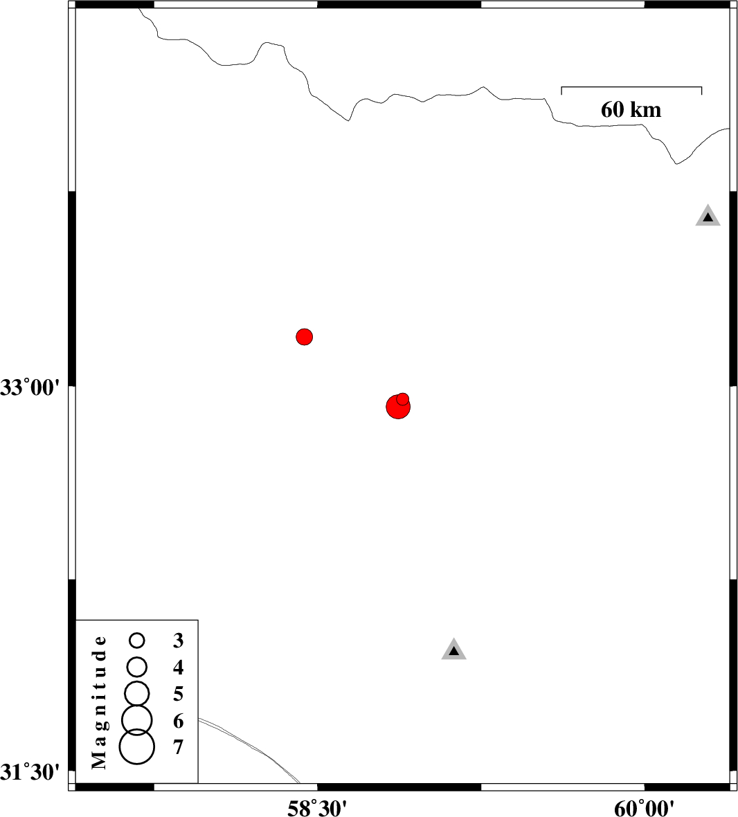| 2013/10/04 | 18:44:37.3 | 22:14:37.3 | 32.95 | 58.89 | 15 | ML2.5 | Khorasan(south) Province, 33 km West of Birjand | ||