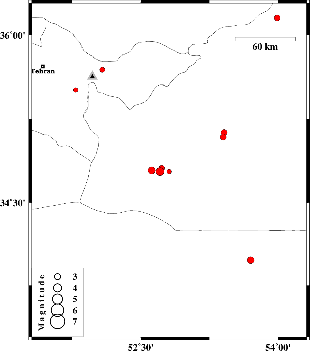 | 2013/09/08 | 16:12:46.0 | 20:42:46.0 | 34.79 | 52.62 | 14 | ML3.5 | Semnan Province, 54 km South-East of Garmsar |