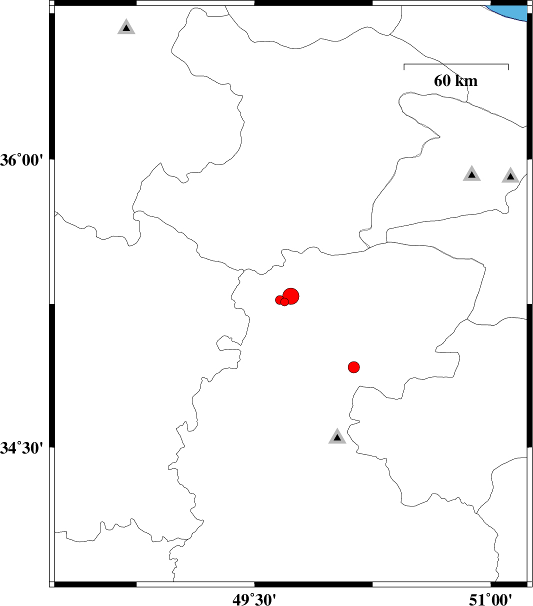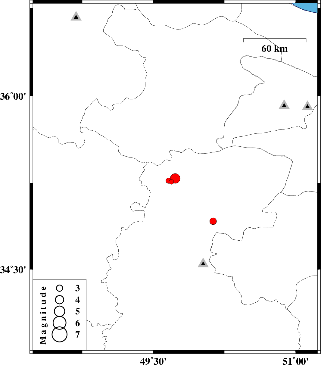 | 2013/10/16 | 08:49:32.4 | 12:19:32.4 | 35.29 | 49.73 | 6 | ML4.6 | Markazi Province, 63 km East of Razan |