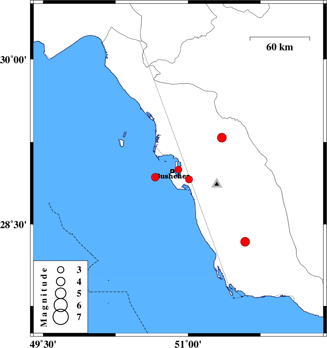 | 2013/10/22 | 11:09:40.7 | 14:39:40.7 | 28.93 | 50.66 | 18 | ML3.6 | Persian Gulf, 18 km West of Busheher | ||