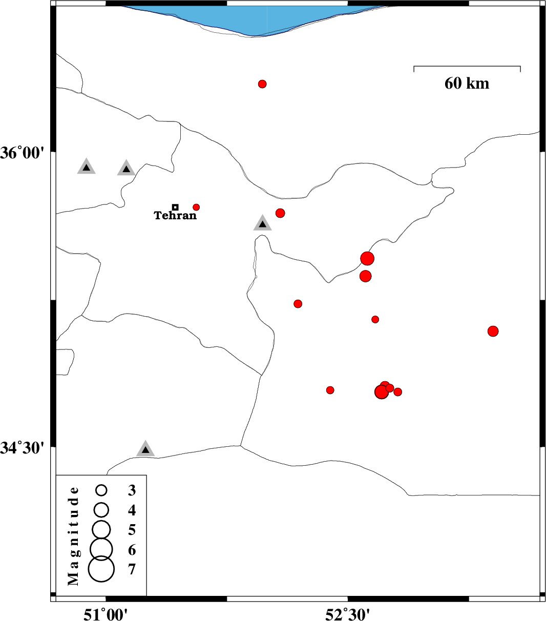 | 2013/10/27 | 19:21:54.6 | 22:51:54.6 | 34.79 | 52.39 | 18 | ML2.1 | Semnan Province, 48 km South of Garmsar | ||