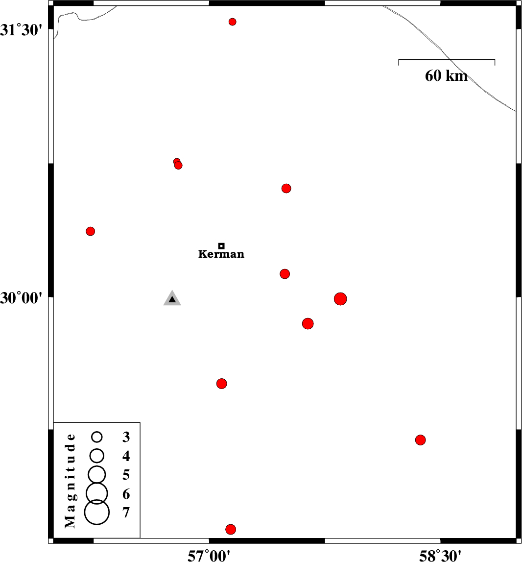 | 2013/10/01 | 17:16:42.8 | 20:46:42.8 | 29.51 | 57.08 | 14 | ML3 | Kerman Province, 55 km North-East of Baft |