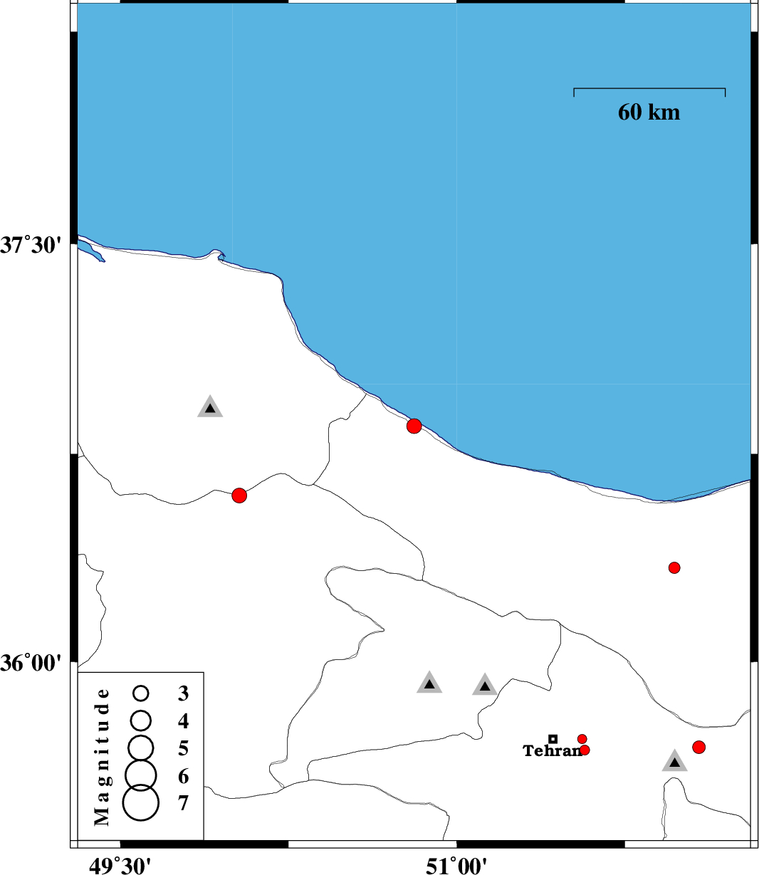 | 2013/10/26 | 09:15:08.9 | 12:45:08.9 | 35.72 | 51.56 | 25 | ML1.8 | Tehran Province, 15 km East of Tehran | ||