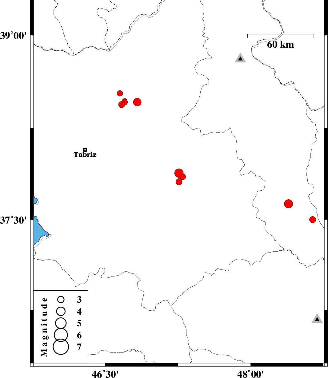 | 2013/10/30 | 16:49:21.7 | 20:19:21.7 | 38.46 | 46.83 | 14 | ML3.6 | Azarbaijan Sharghi Province, 22 km West of Ahar | ||