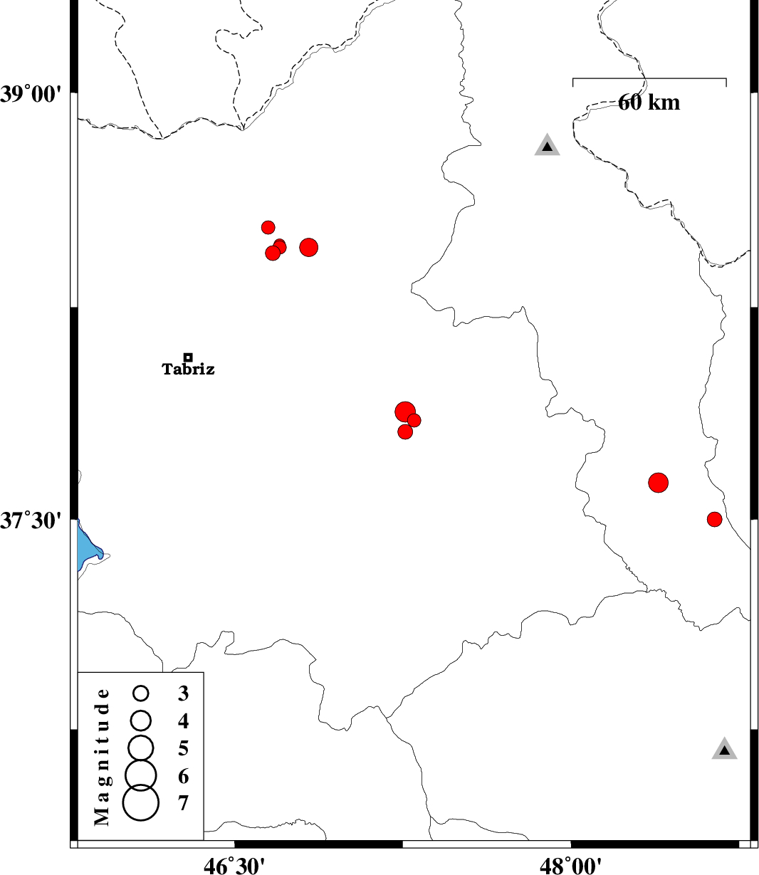 | 2013/11/05 | 03:29:34.6 | 06:59:34.6 | 37.85 | 47.3 | 16 | ML2.7 | Azarbaijan Sharghi Province, 23 km West of Sarab | ||