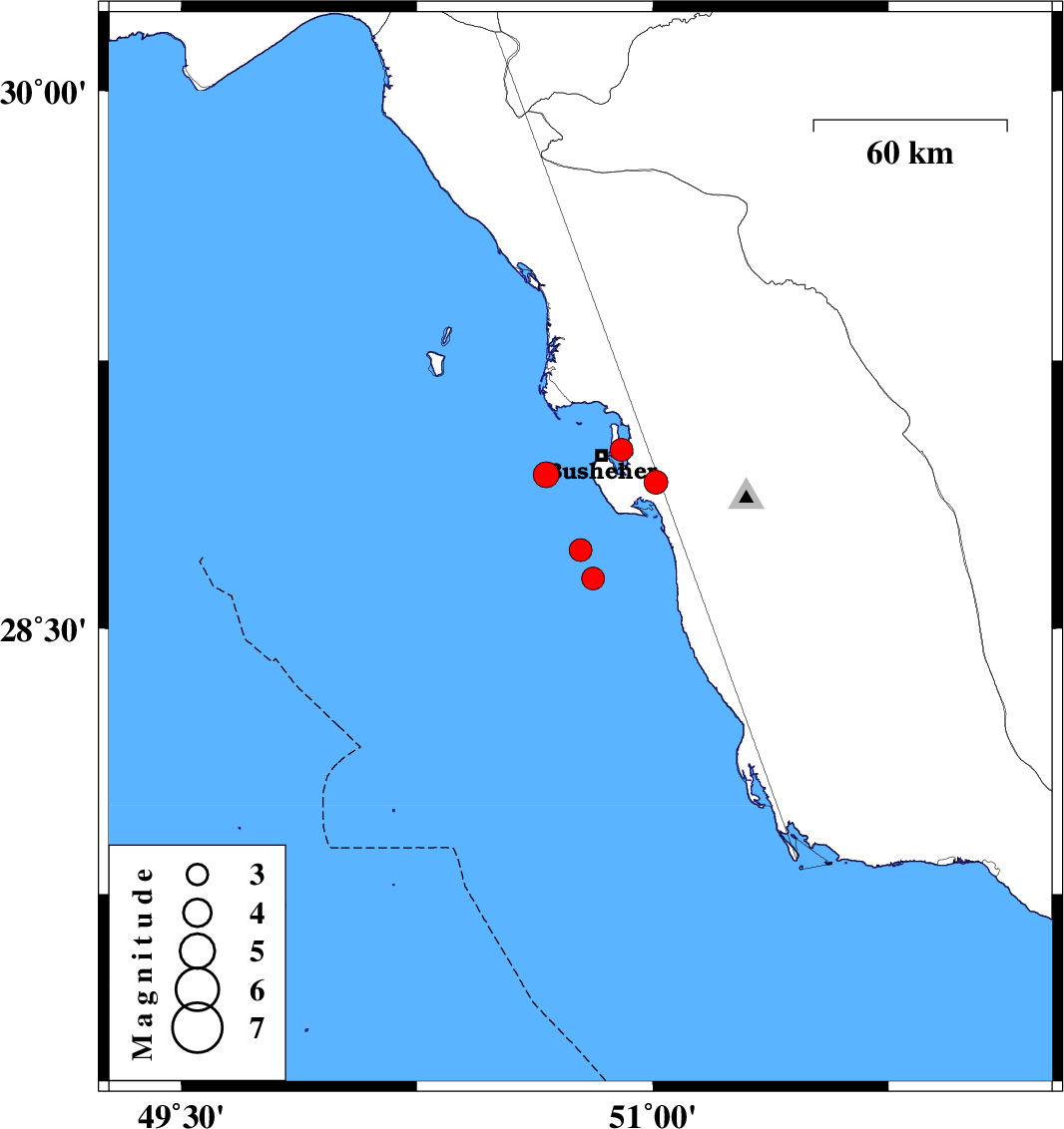 | 2013/10/22 | 11:09:40.7 | 14:39:40.7 | 28.93 | 50.66 | 18 | ML3.6 | Persian Gulf, 18 km West of Busheher | ||