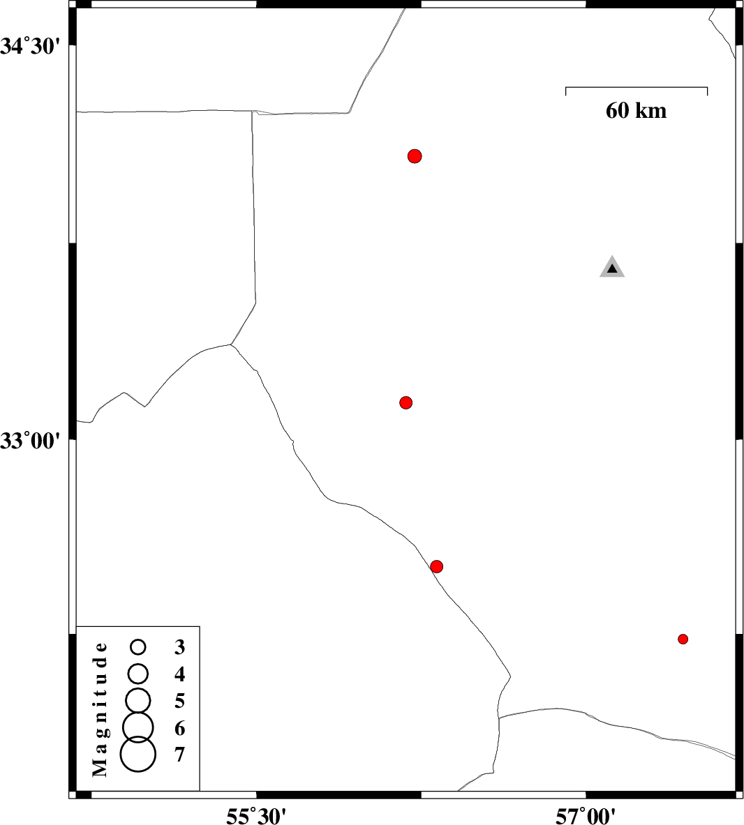 | 2013/10/20 | 18:30:23.8 | 22:00:23.8 | 34.08 | 56.22 | 32 | ML2.8 | Yazd Province, 84 km North-West of Tabas | ||