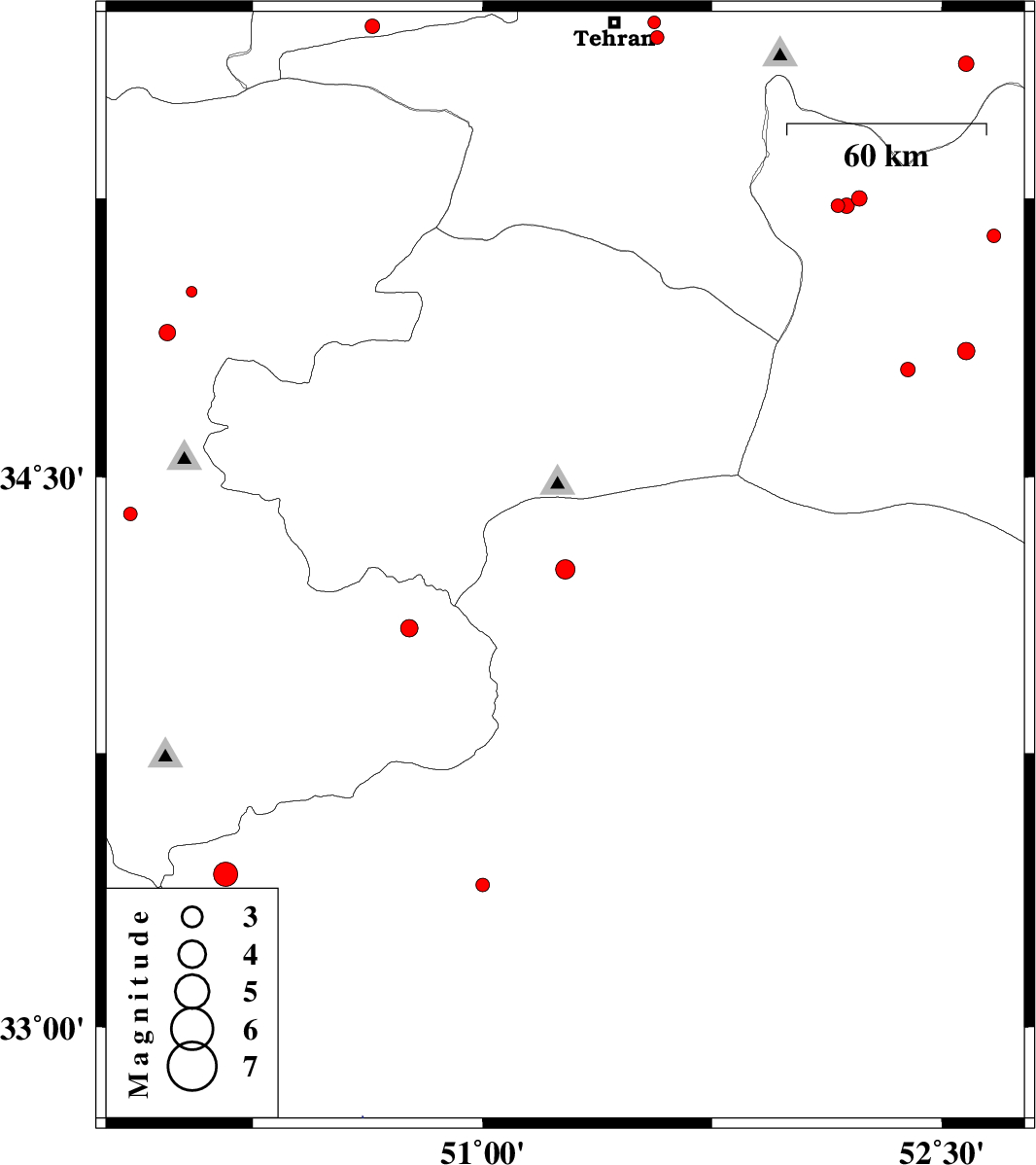 | 2013/10/26 | 09:15:08.9 | 12:45:08.9 | 35.72 | 51.56 | 25 | ML1.8 | Tehran Province, 15 km East of Tehran | ||
