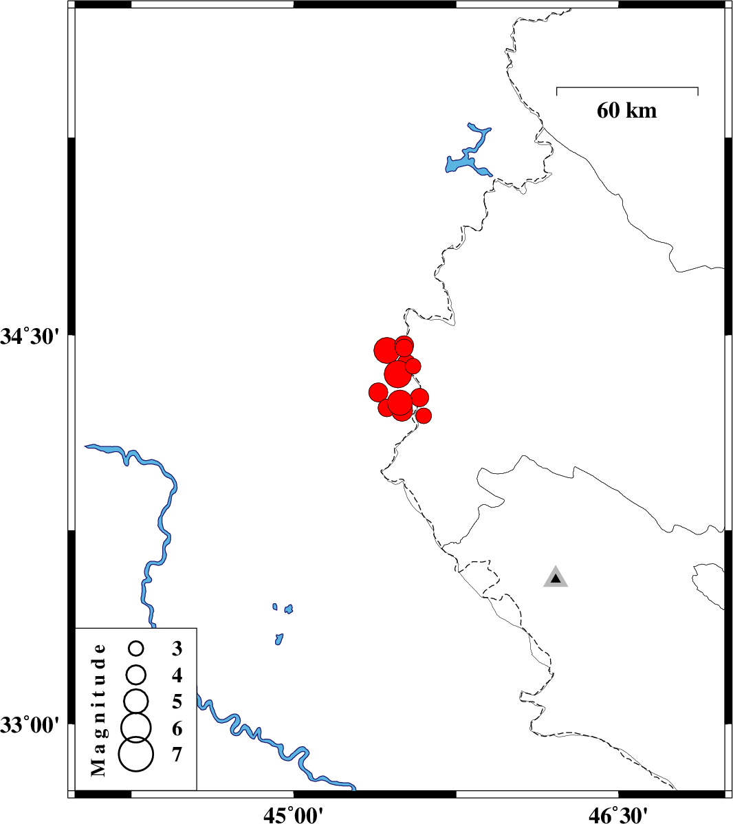 | 2013/11/23 | 06:52:02.4 | 10:22:02.4 | 34.26 | 45.58 | 15 | ML3.8 | Iraq, 28 km South of Qasr-E-Shirin | ||