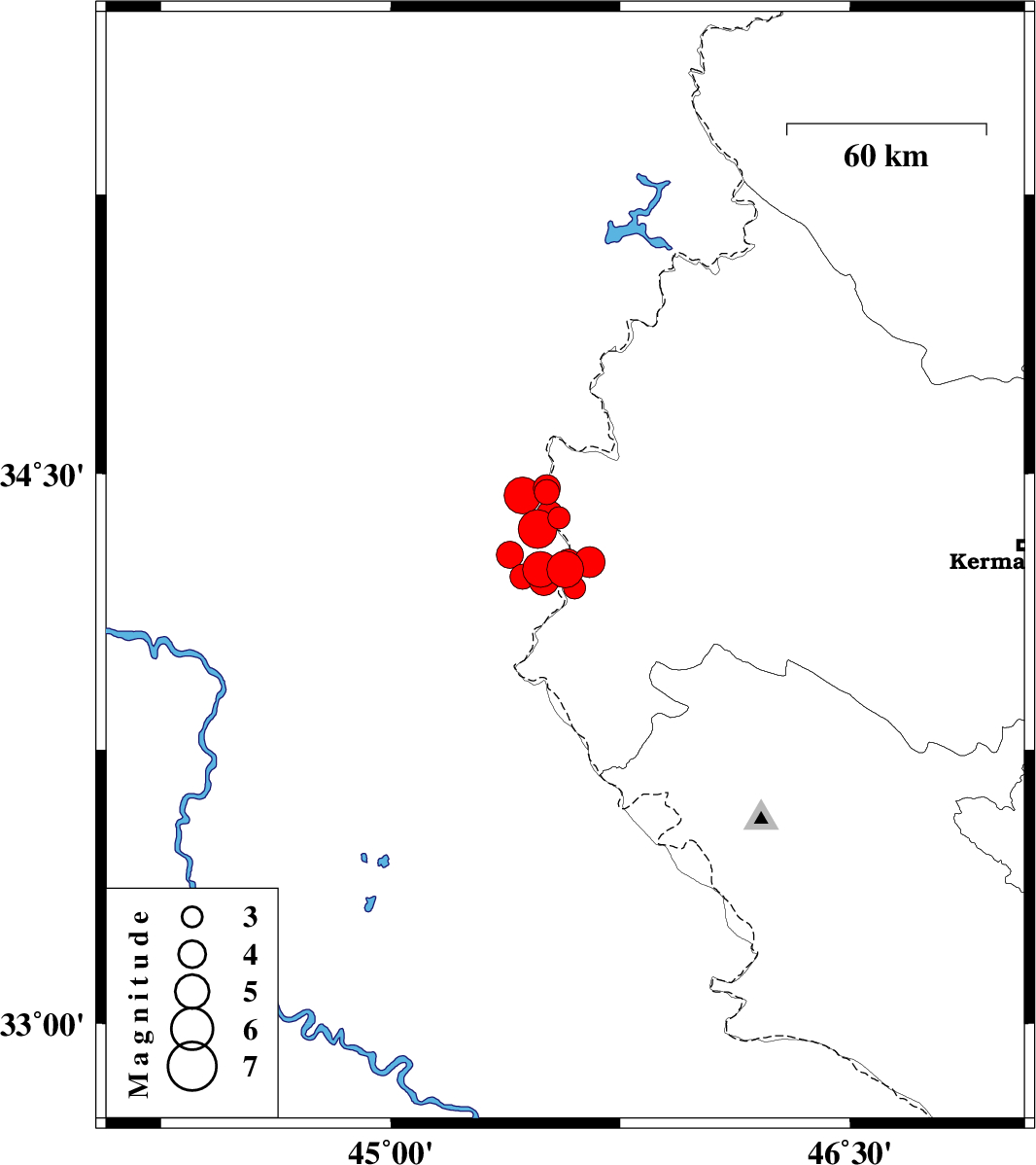 | 2013/11/23 | 06:52:02.4 | 10:22:02.4 | 34.26 | 45.58 | 15 | ML3.8 | Iraq, 28 km South of Qasr-E-Shirin | ||
