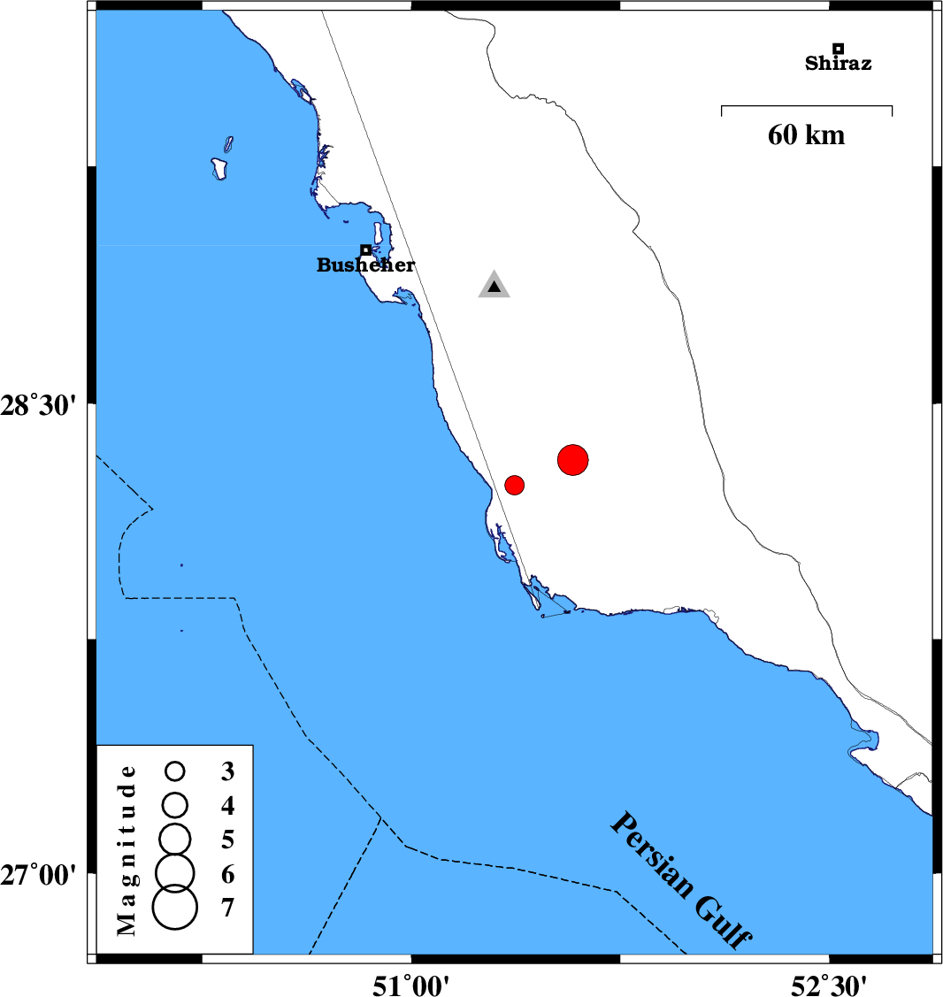 | 2013/11/19 | 09:06:21.4 | 12:36:21.4 | 28.32 | 51.58 | 7 | ML4.9 | Bushehr Province, 43 km South-East of Khormog |