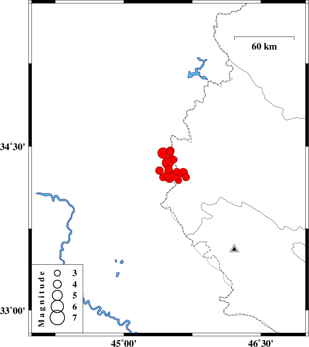 | 2013/11/23 | 06:52:02.4 | 10:22:02.4 | 34.26 | 45.58 | 15 | ML3.8 | Iraq, 28 km South of Qasr-E-Shirin | ||