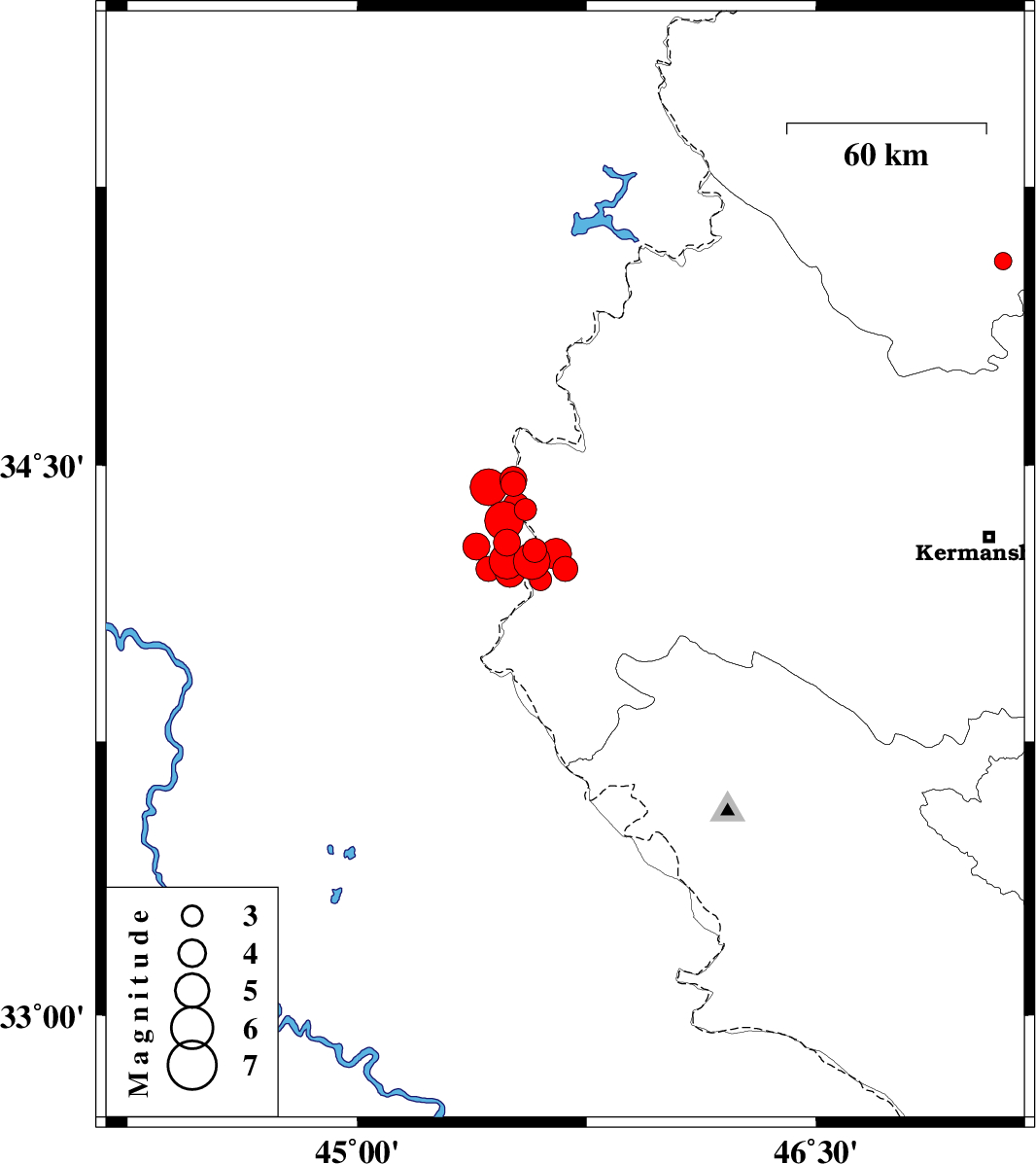 | 2013/11/22 | 06:51:25.7 | 10:21:25.7 | 34.44 | 45.43 | 14 | ML5.4 | Iraq, 16 km West of Qasr-E-Shirin | ||