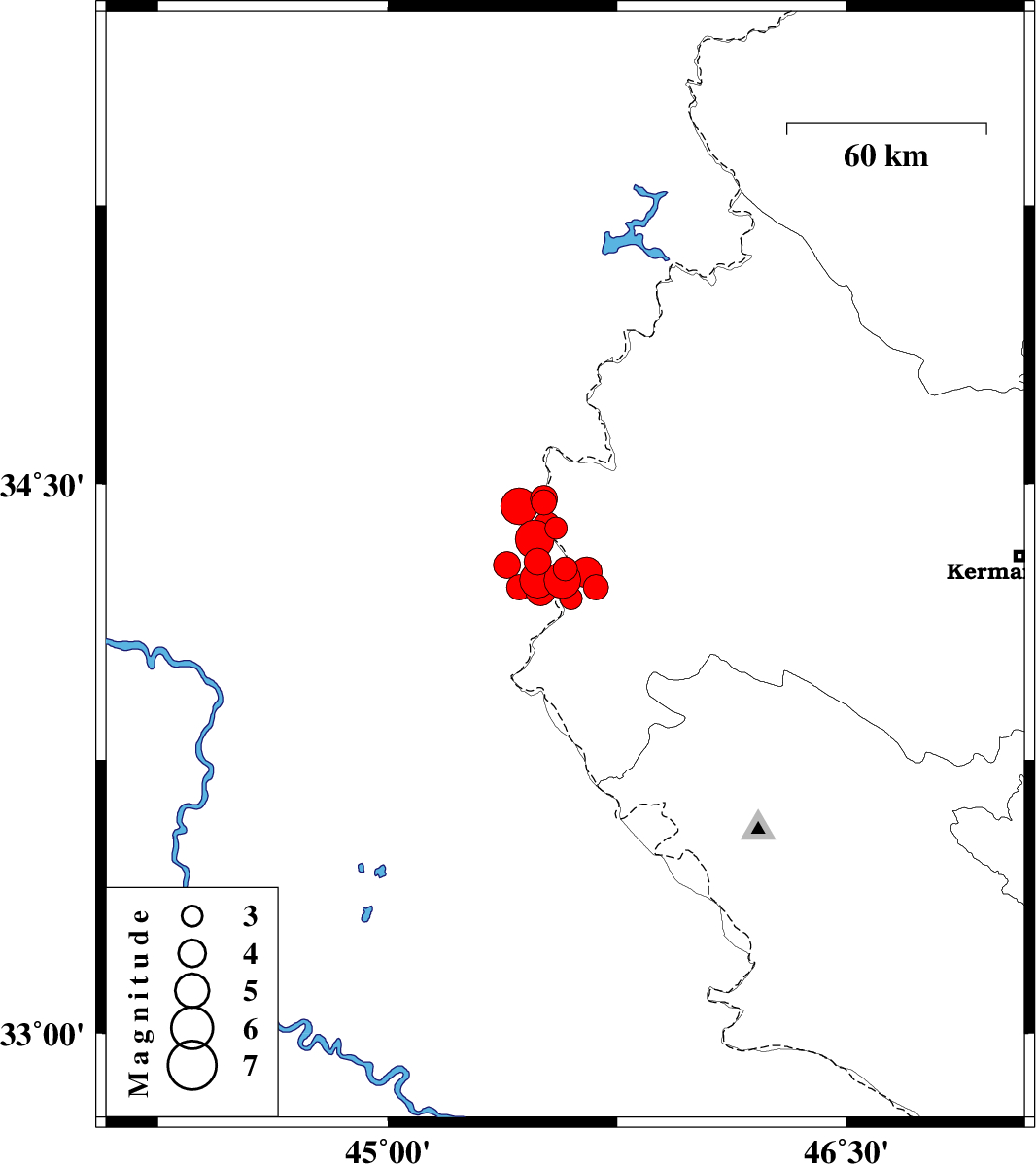 | 2013/11/23 | 06:52:02.4 | 10:22:02.4 | 34.26 | 45.58 | 15 | ML3.8 | Iraq, 28 km South of Qasr-E-Shirin | ||
