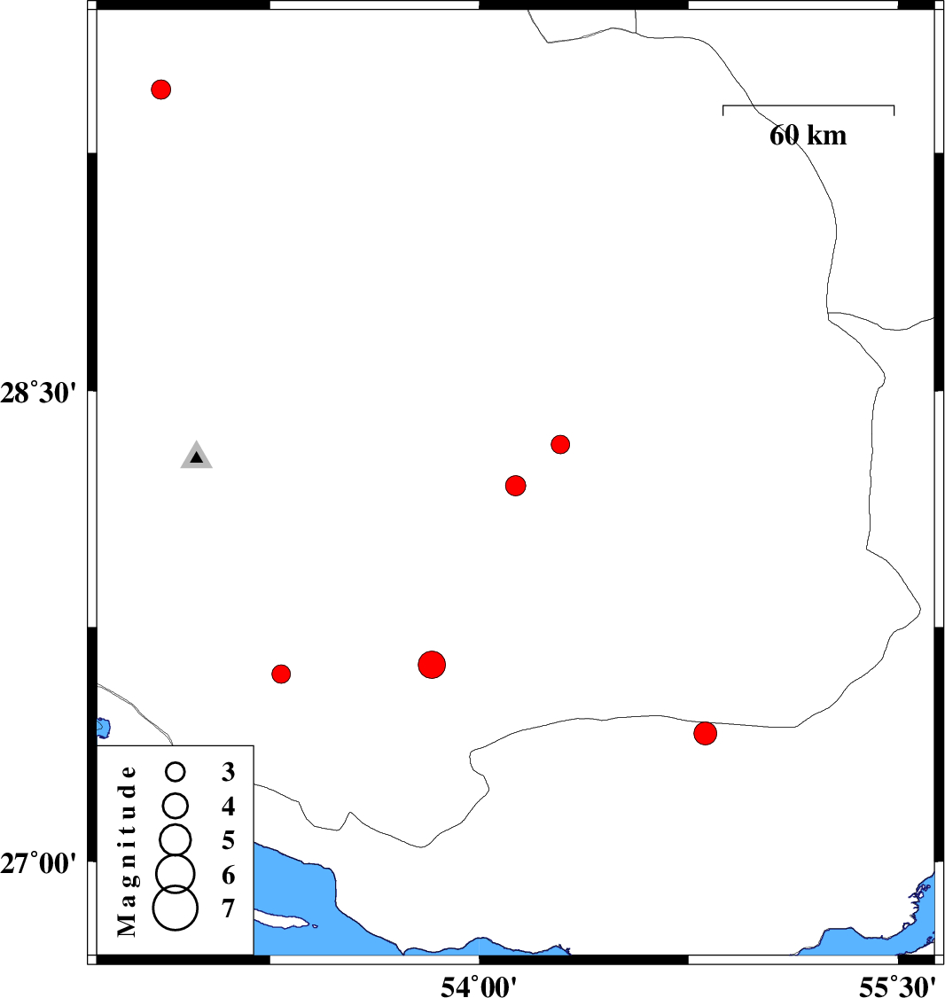 | 2013/11/27 | 14:43:54.6 | 18:13:54.6 | 28.2 | 54.13 | 15 | ML3.2 | Fars Province, 62 km North-West of Lar | ||