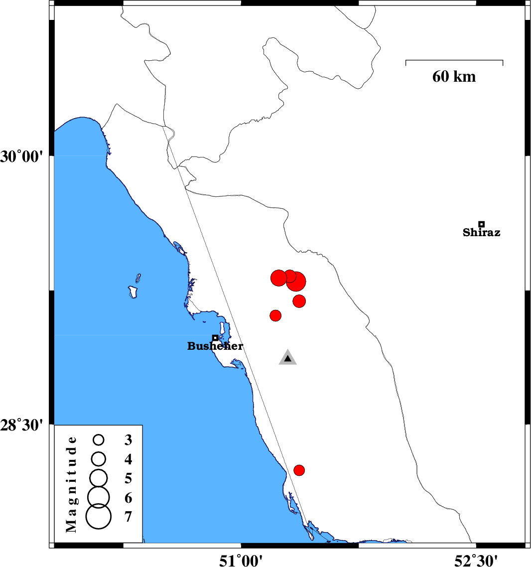 | 2013/11/28 | 13:51:35.5 | 17:21:35.5 | 29.3 | 51.35 | 15 | ML5.6 | Bushehr Province, 15 km East of Borazjan | ||