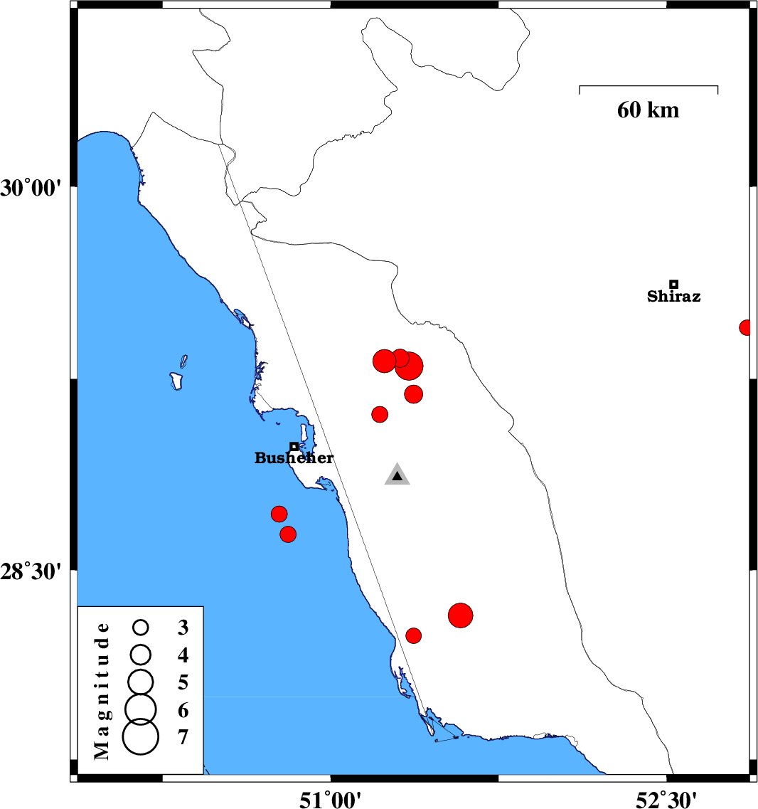 | 2013/11/28 | 20:57:28.0 | 00:27:28.0 | 29.11 | 51.22 | 15 | ML3.2 | Bushehr Province, 17 km South of Borazjan | ||