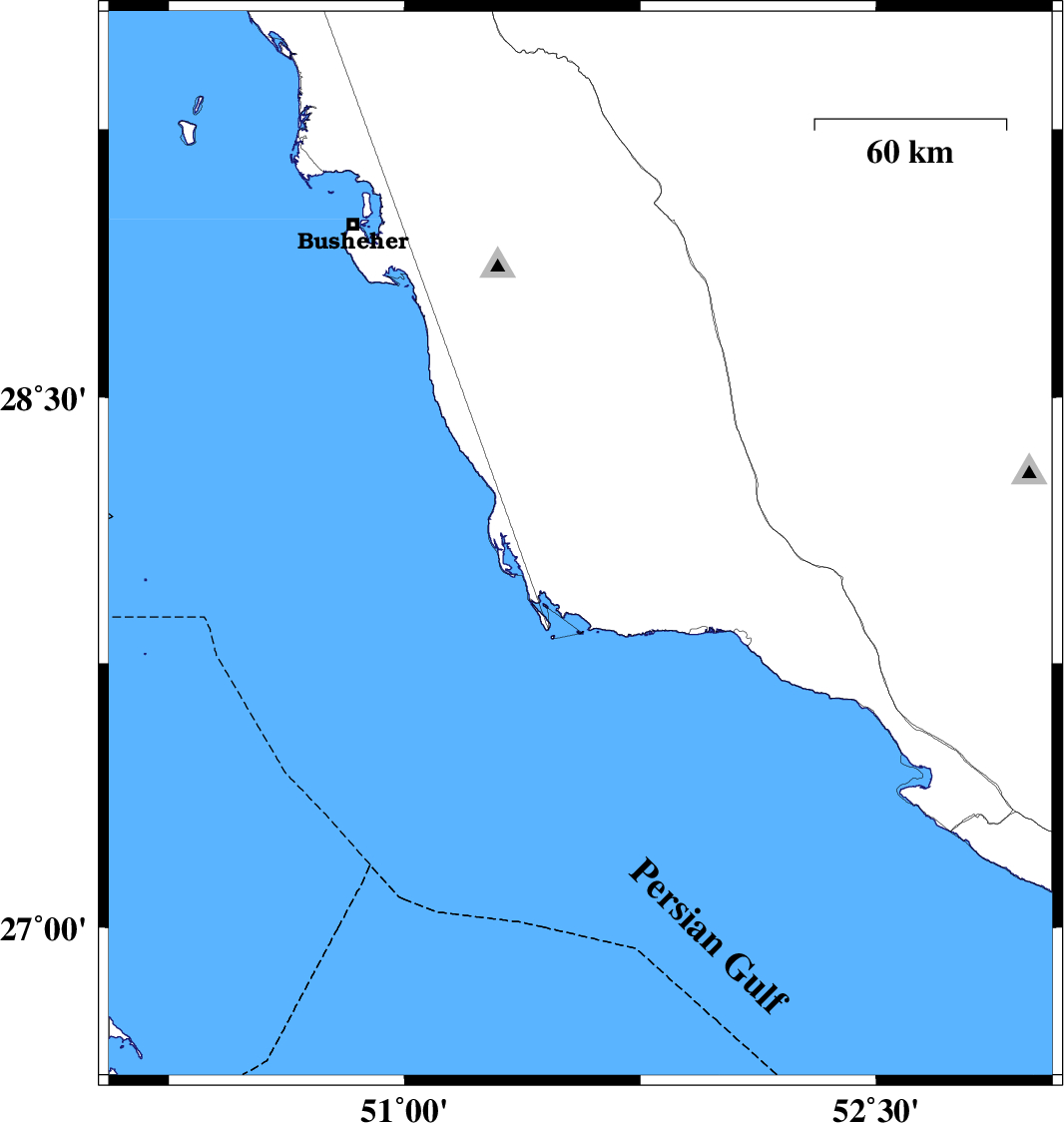 | 2013/11/29 | 18:46:04.3 | 22:16:04.3 | 29.12 | 51.29 | 15 | ML3.2 | Bushehr Province, 18 km South of Borazjan | ||