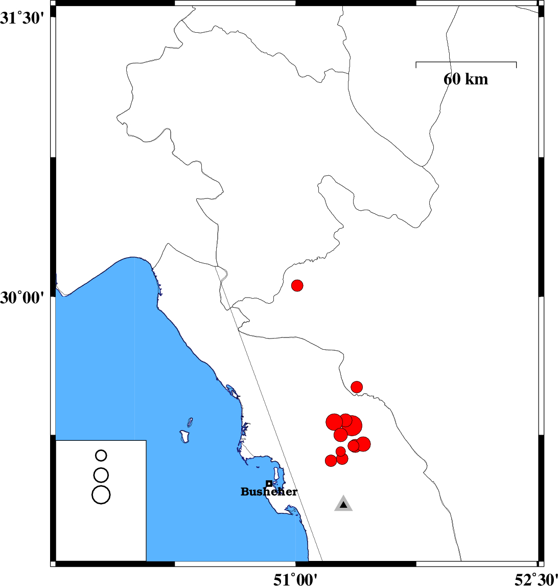 | 2013/11/29 | 18:46:04.3 | 22:16:04.3 | 29.12 | 51.29 | 15 | ML3.2 | Bushehr Province, 18 km South of Borazjan | ||
